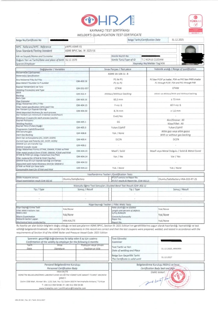 Demirkanat olarak yapmış olduğumuz çalışmalarda TÜRKAK akrediteli personel belgelendirme kapsamında düzenlenen kaynakçı sertifikaları: